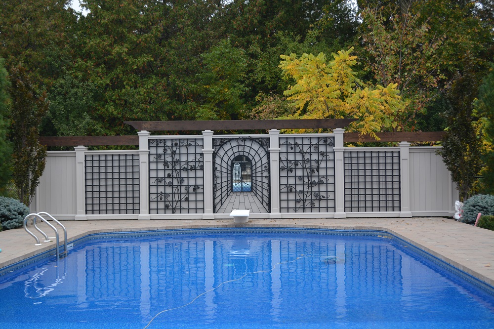 “Is adding trompe l’oeil to the equation too much? Well, since I had already stepped over that line with this design, I decided to add some contrasting trelliswork—some made out of red cedar, and some of wrought iron—to add to the degree of difficulty. That’s how magic happens, even though this destination screen really is just a fence,” he adds.