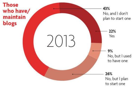 While many respondents in the 2013 survey say they don’t have blogs, others certainly do. Nearly one-fourth have blogs, and a slightly higher number plan to start one.