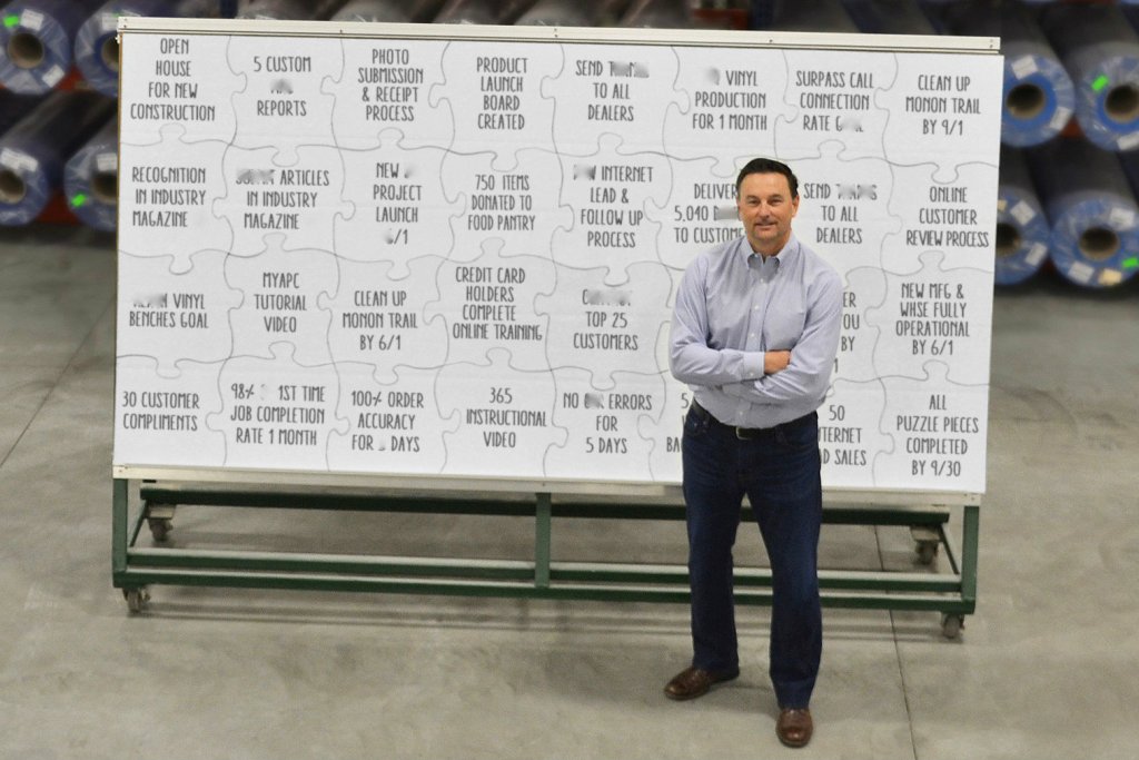 It is a 5-by-10-foot, 32-piece puzzle board on wheels and gives every employee the opportunity and motivation to directly contribute to our corporate goals. The board travels around the warehouse and into monthly meetings, serving as a constant visual reminder of what we are trying to achieve even while we are all extremely busy throughout the season.