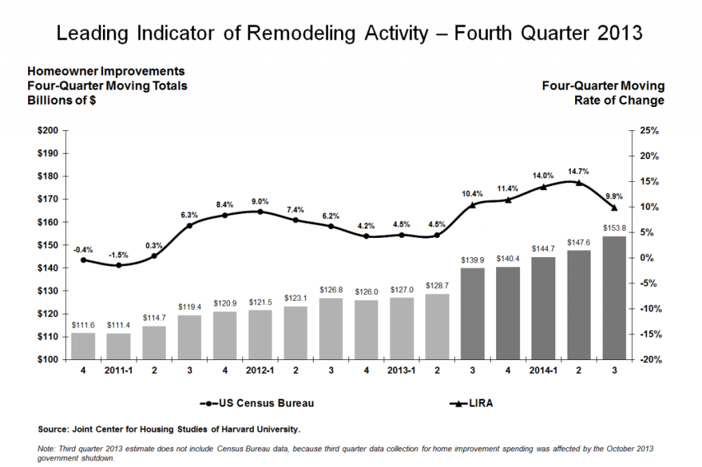 Harvard’s Joint Center for Housing Studies expects double-digit growth in big-ticket single-family home remodeling at least through the first half of this year. By the last quarter of 2014, increases are expected to descend, but to a still-respectable rate just under 10%.