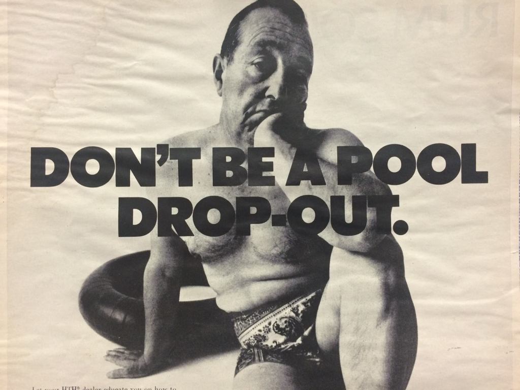 Don: I present the “Pool Drop-Out.” Tagline: “HTH Dry Chlorine: The mark of an educated pool.”