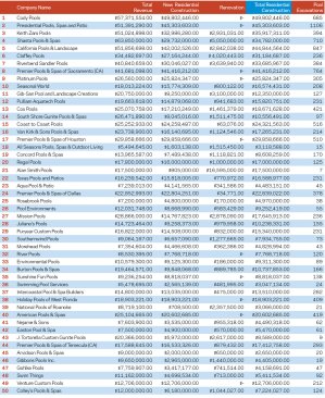 Residential Construction Revenue is calculated by combining earnings from new residential construction and renovations. Of the five judging criteria, this factors in the most. Once again, Cody Pools, headquartered near Austin, topped the list of highest earners. It generated nearly $50 million in residential construction, representing almost a 13% jump from last year’s $44.2 million. Cody is joined by five Lone Star State compatriots in this Top 10 list. Three of the remaining companies hail from Arizona, with the last from California. In residential construction, this year’s group earned $816.8 million, a 5% increase over the 2017 Top 50, whose reported residential construction earnings combined for $777.9M.