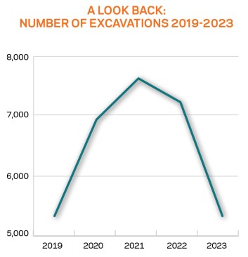 Some define success as maintining levels from 2019, before the COVID bubble. The trend couldn’t be more well-defined than above: The builders in our sample saw almost the exact same number of digs in 2023 (5,316) as they did in 2019 (5,315).