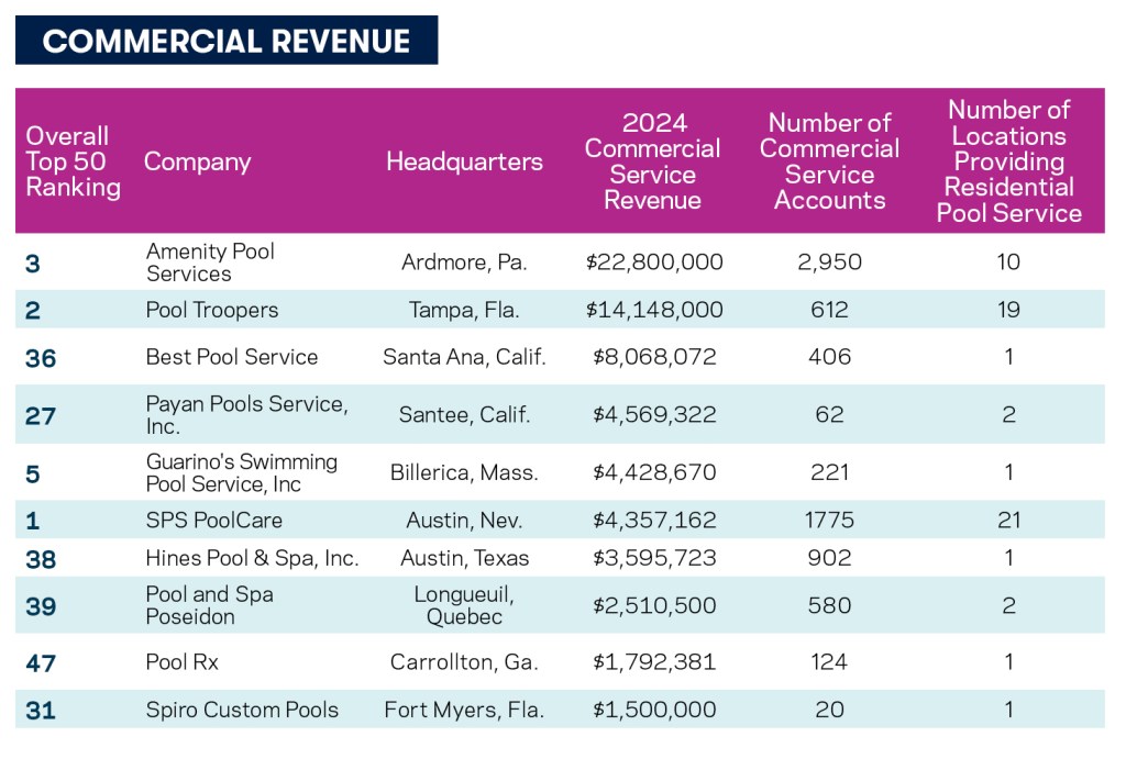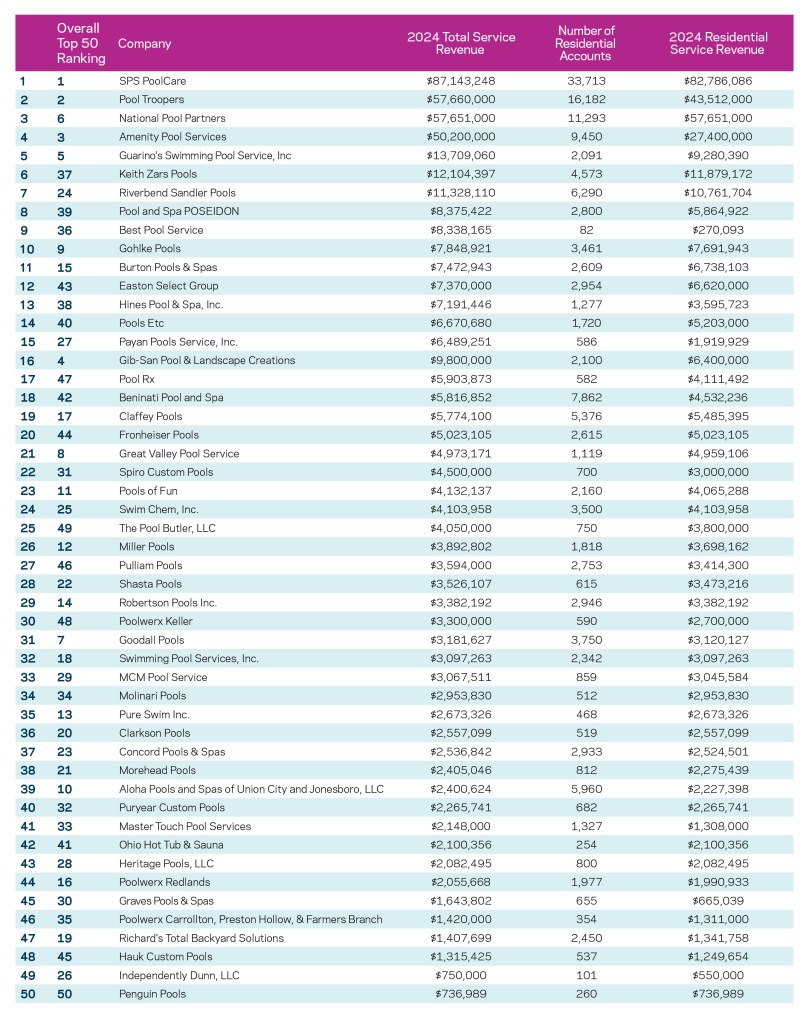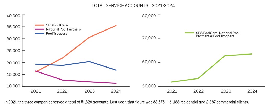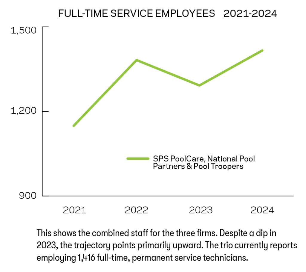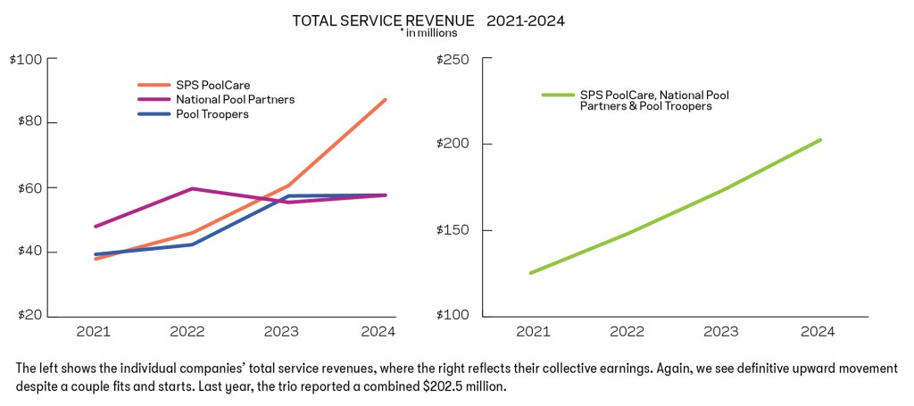 If this decade becomes known for anything in industry history, it will be for the potentially transformative power of consolidation, especially in the pool/spa maintenance sector. The movement started at the beginning of the decade, and it has made itself known in the Top 50 Service list, with several now ranking. So far, three have made the list long enough to track — SPS PoolCare (formerly Smart Pool Services, with 21 locations), Pool Troopers (19 locations), and National Pool Partners (10 locations), which all have made the list for the last four years in a row. These charts provide data points to explore how the three performed from 2021 to 2024. Growth may not have been as aggressive as expected, given the tempering effect of some economic realities. But these figures suggest that, as a combined force, these consolidators continue to gain.