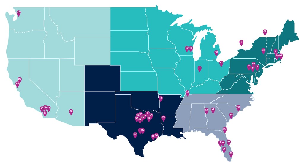 The map below shows how this year’s Top 50 Service companies are distributed throughout the U.S. and Canada. Each numbered tab represents one firm, placed in its headquarter city. The numbers indicate company ranking. Texas once again stands out, holding 14 of the slots, or 28%.