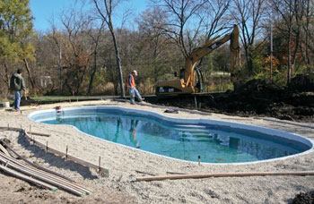 The pool is then lowered into the hole, and sand is shoveled into the hole while wetting it to make sure it compacts completely. This type of compaction cannot be achieved with most other backfill materials, including gravel. Although the gravel may appear to be completely compacted, it is still subject to ground movement and settling over time. Sand, when compacted correctly, will form a very dense, and secure, barrier between the pool and the excavation walls, offering support without jagged edges to scrape against the plumbing lines and the pool shell.