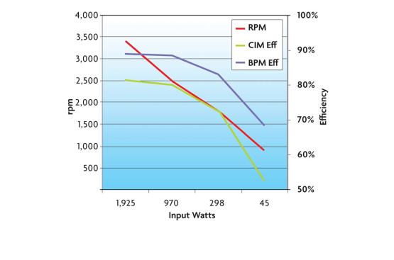 Here is an efficiency comparison chart comparing a standard three phase variable-speed motor vs. a BPM variable-speed motor being run on the same pool pump using the same VFD. The only difference in this test is the motor type. As the chart shows, BPM efficiency is significantly higher across the speed range.