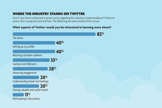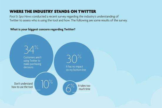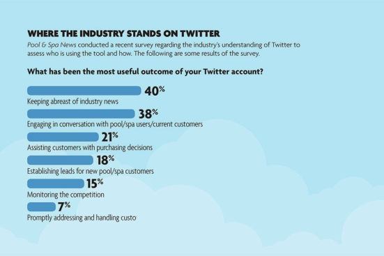 While users run the gamut from popular food brands to famous actors and dads with a penchant for fishing, most members of the swimming pool and spa industry have yet to tap into Twitter. In fact, in an exclusive Pool & Spa News survey, 75 percent of the participants did not have a Twitter account for business purposes. The top two reasons cited were a lack of understanding for the tool, and an unclear vision of how using it would fit into a marketing campaign.