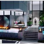 The couple also wanted to showcase the view of the Intracoastal, while providing more secluded areas that can’t be viewed by passing watercraft. Designers were required to incorporate a mass of features, including a lazy river, glass tile mural, acrylic glass element, fire and water features, sunken firepit, swim-up bar, splash pad, tanning shelf, dramatic front entry and a dramatic fountain for the driveway.