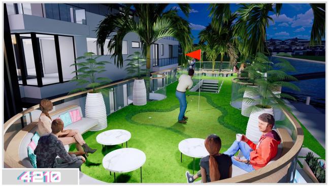 He decided to design a shade structure modeled after a yacht hardtop. This would provide the centerpiece for the backyard, as well as serve a number of practical purposes. It would have two levels, with the upper deck providing a spectacular view with seating and the putting green the clients requested. It would also act as a feature-packed island for the lazy river to wrap around. Such elements as the sunken fire pit, fire/water feature, tile mosaic and UltraVision multi-panel display would be placed here.