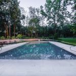 B) Custom made: The pool features close to 250 fiberoptic “stars” and a custom blend of glass tile and natural stone on the sun shelf. The homeowner was particular about the tile/stone color mix, wanting to make sure it perfectly accented the French gray plaster of the pool before he would approve it. “Layout and preplanning were essential,” Atlas says.