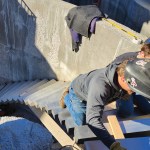 In applying the surface of the main pool, because it’s so deep and expansive, we’ll have to install a number of tile breaks throughout. We’ll run rows of tile bisecting the pool into multiple sections and vertical planes. This will allow the crews to stop and restart the plaster work. At its deepest, the pool is 17-1/2 feet, so it’s impossible to get all the plastering done on one set of scaffold. With our plan, they can work up to a tile break, set new scaffold, and work down into the pool to finish the material properly. We’ll need to erect three layers of scaffold to plaster the pool. We’ll do our best to color-match the tile with the pebble finish so we minimize visibility.