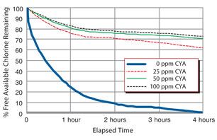Cyanuric acid works to preserve chlorine sanitation levels in outdoor pools. But as the chart demonstrates, 25 ppm of CYA should sufficiently guard against UV rays. Notice there’s almost no difference in chlorine deactivation between 50 ppm and 100 ppm of CYA.