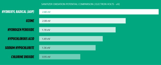 Hydroxyl radicals (•OH) are the most powerful oxidation agents available, quickly destroying bacteria, viruses, pathogens and other contaminants that occur in water. Hydroxyl radicals also destroy chlorine resistant microorganisms, such as Cryptosporidium Parvum, Giardia and E.Coli.