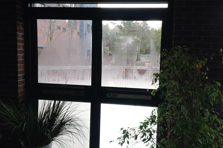 In the natatorium, condensation on exterior walls and ceilings should not occur. Window and skylight condensation indicates the glass is not covered with warm dehumidified supply air and its temperature has dropped below dew point.