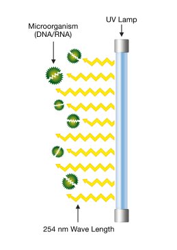 Germicidal UV systems (also known as Ultraviolet Sterilizers) pass water through a chamber and expose it to light, which kills microorganisms and breaks down chloramines using light energy. In order to sanitize water, specific UV light rays must be used – 254 nm has the greatest germicidal action. The germicidal light alters or disrupts the DNA or RNA of microorganisms such as algae, bacteria, viruses, mold spores, and protozoa. This essentially destroys the microorganisms as they pass through the UV chamber.