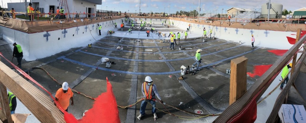 The physical position changes to suit the pool’s contours. His company’s crews will trowel perched up on cleats and bending down for extended periods when finishing the floor. Over time, the awkward positions and repetitive motion of troweling and other tasks can have an impact on elbows, ankles, knees and shoulders.