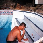 7. As the pool fills and the shallow end is covered with water, the vacuum is removed and the fittings (light faceplates, skimmer faceplates and the like) can be cut in. The faceplates are locked in now, and you can trim out the vinyl inside the fittings with a sharp knife.