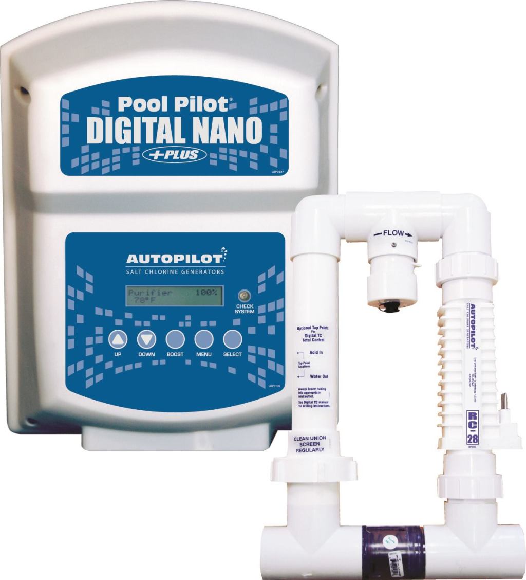 The Pool Pilot Digital Nano+ is a salt chlorine generator that maintains pools up to 28,000 gallons.