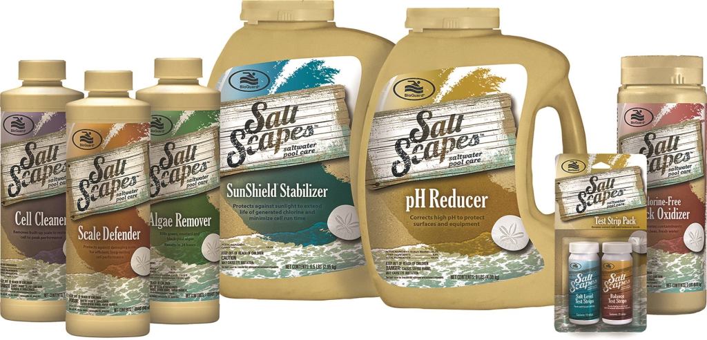 SaltScapes Saltwater Pool Care is a “salt-specific” product line that addresses the challenges of salt cell generators and the impact of saline chlorination on water condition.