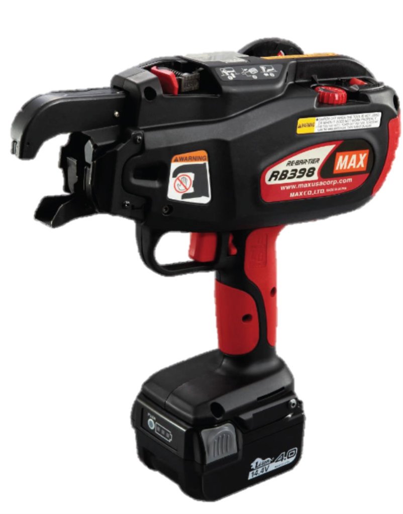 The MAX Re-Bar-Tier RB398 is a battery-operated rebar tying tool. It ties rebar intersections in less than one second, with a consistent tie strength. It completes more ties per battery charge with a 4.0 Ah Li-ion battery that recharges in 40 minutes.