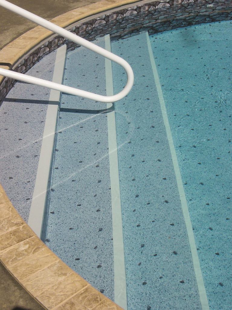 E-Z VIEW steps by Pen Fabricators use the liner floor pattern over the steps, with an additional white or blue “stripe” welded on the point where the riser meets the tread. The stripes are approximately 2 inches wide on the tread, with an additional 2 inches on the riser, making it easy for swimmers to see the steps going in or out of the pool. It’s good for today’s printed, textured material for vinyl-covered steps. Contact: (800) 359-5350; www.penfab.com