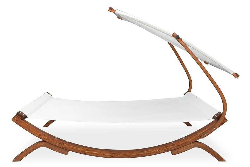 The Hillsboro Double Hammock by Urban Home features an elegant curved wooden frame and all-weather reinforced nylon fabric in crisp white. It measures 71 inches wide by 56 inches high and 88 inches deep. The hammock sits 12 inches above the floor in the center.