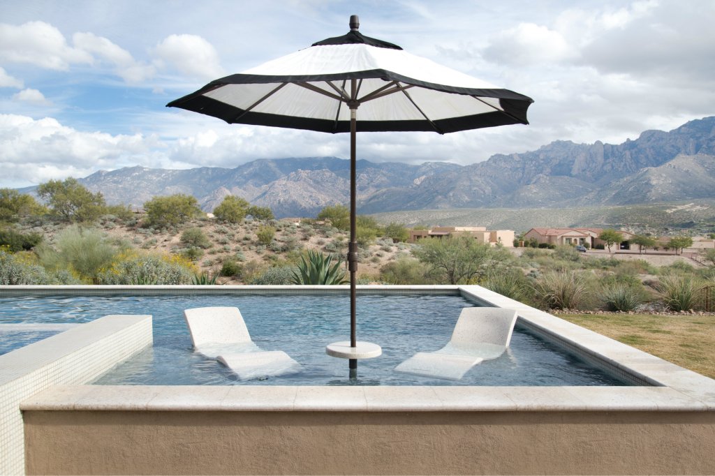 The lounger is designed for sun shelves up to 12 inches for all pool types. It features a patent-pending fill system to eliminate buoyancy and is easy to drain for easy removal when not in use.