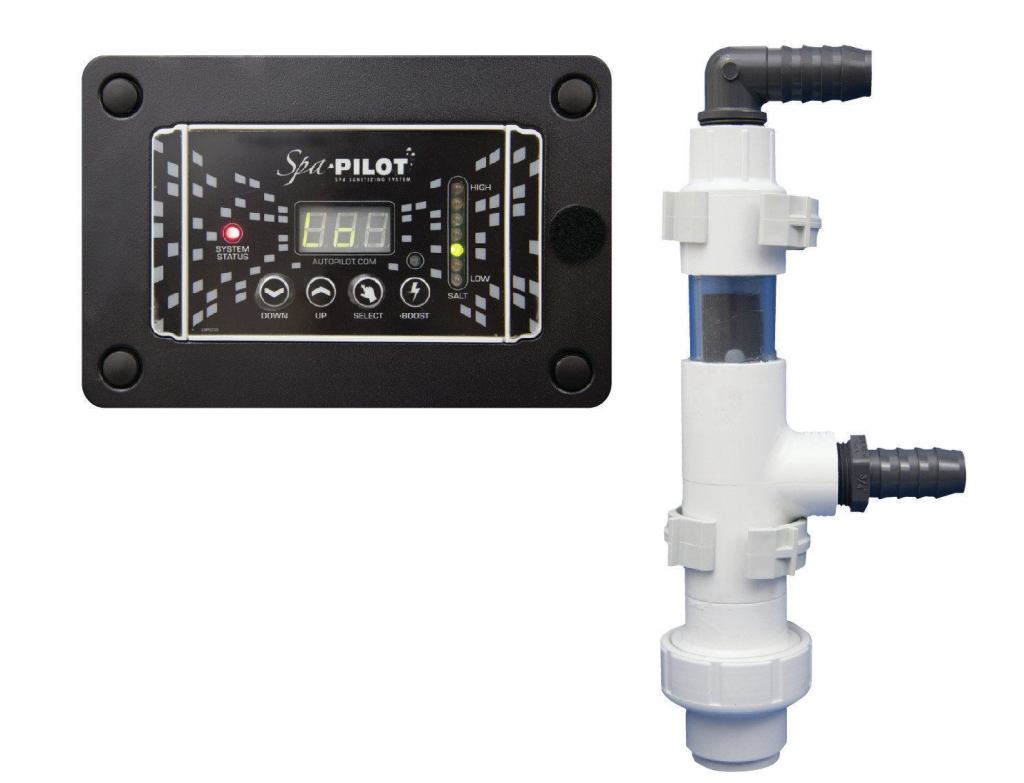 The SpaPilot sanitizing system from AquaCal AutoPilot uses salt to treat spas up to 1,200 gallons. It produces 0.048 pounds of chlorine/bromine per day and operates in salt conditions as low as 1,000 ppm. It features digital display, push-button controls, boost button, boost LED indicator, salt level indicators, built-in diagnostics and error reporting. The Inline model is for professional installers; the Over the Wall is for spa owners.