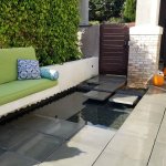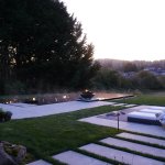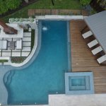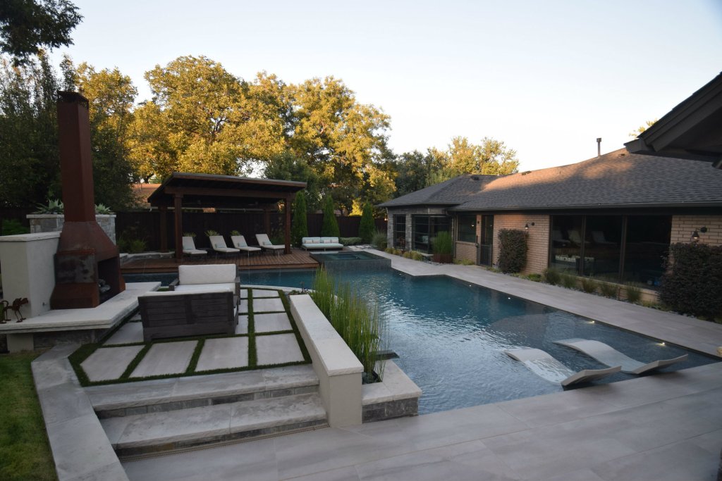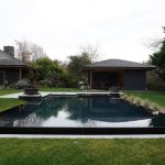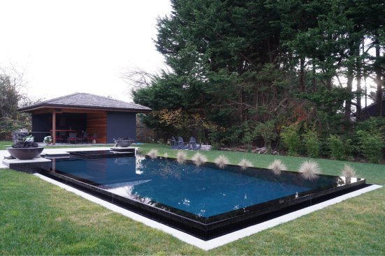Two main objectives guided the design of this pool: Preserving views from the home, and presenting a softened geometric form. This was achieved by keeping structures and furnishing to the back of the yard so it wouldn’t block views from the house, and incorporating some curves to the mostly linear form.