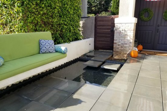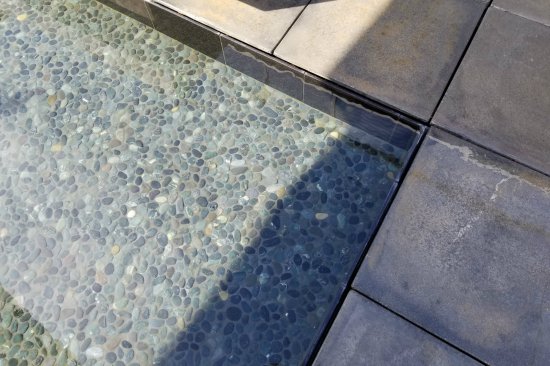 A slot-edge detail frames three sides, while a gutter and planter cap the fourth. When not in use, the corner spa is hidden under water. When activated, cold and hot water separate on either side of a channel.