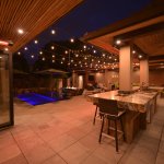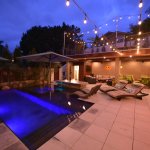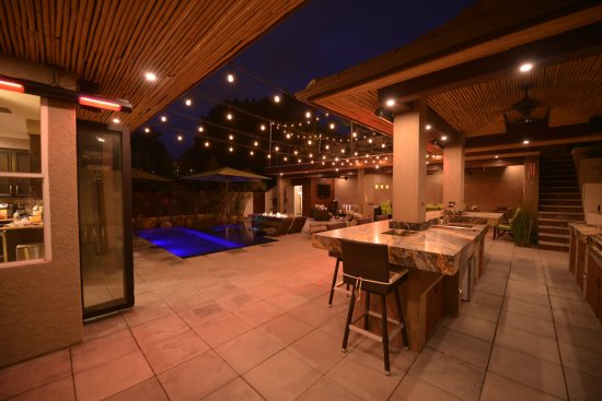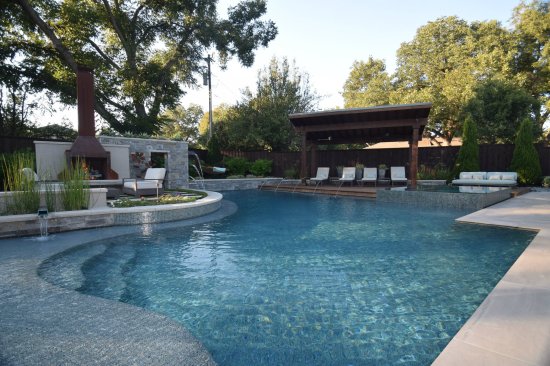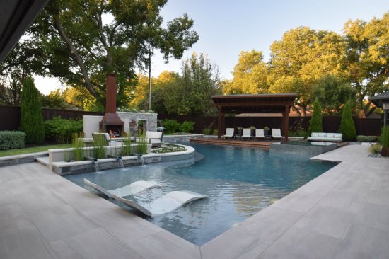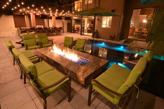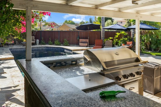 He spared no expense on materials, including a 2-by-2-inch glass tile and 4-inch-thick Cherokee Creek sandstone for the deck. Other features included colored and regular LED lights for the pool and landscape, and outdoor kitchen, misting system, and high-tech subterranean audio system with subwoofers and six speakers strategically hidden throughout the yard.