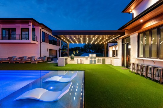 “The home is very contemporary, but the setting is not,” says Schindler, who has since established Schindler Design Co. in Edmond, Okla. “It’s a very lush natural setting. Every time we did [a three-tier design], it didn’t fit the landscape. It was too harsh — there was too much up and down; it was just too jagged.”