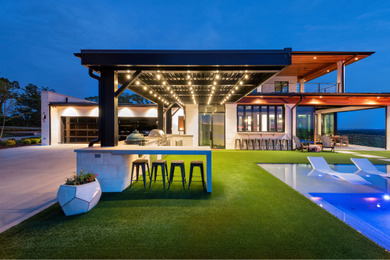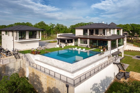 Take this hillside project in central Texas. With about 100 feet worth of elevation change, it originally seemed to designer Reid Schindler that the natural solution would involve a three-tier waterscape — a tanning ledge up top, a play pool at mid level, and a diving pool below. While this would have been the simplest to engineer, as it would follow the topography, it was visually too complicated for the accompanying contemporary home and the clients’ tastes.