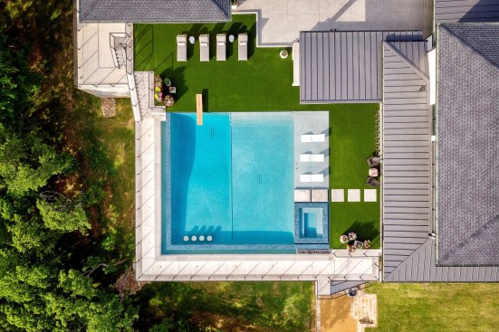 Instead, he decided to provide all the functionality of the three vessels in one generously sized pool. This came by merging two pools into one. Joined on their longer sides, the rectangles — a shallow play pool and a deeper diving pool — formed a near-square shape.
