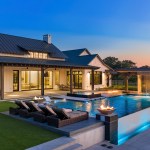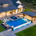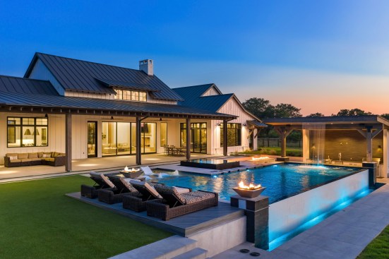 The covered patio with sunken kitchen serves as a major tie-in to the home’s rustic side, borrowing from its roof and featuring plenty of lumber. A poolside composite deck adds to the rustic side of the equation. Some of the stylistic callbacks were more subtle, such as steel ties on the patio structure.