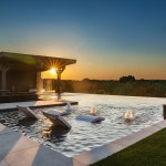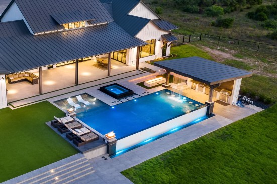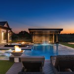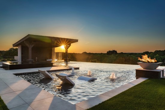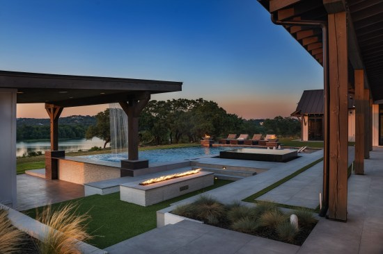 Placement of the major components largely served the view of the river. The patio structure was kept to the side so it wouldn’t block the view. Not only, that, but the team placed it on the only side where a neighboring home may be built in the future. The spa sits relatively low, with no coping to complicate things. Overall, the effect was low-profile and subtle. The team wanted to add some more dynamic water for contrast, so they chose a rain curtain to separate the sunken kitchen from the pool. “We didn’t have a flashy type of waterfeature for the pool,” says Curt Collier, a design consultant with San Antonio-based Keith Zars Pools. “It was all pretty low-key. Even the infinity edge was not that tall.”