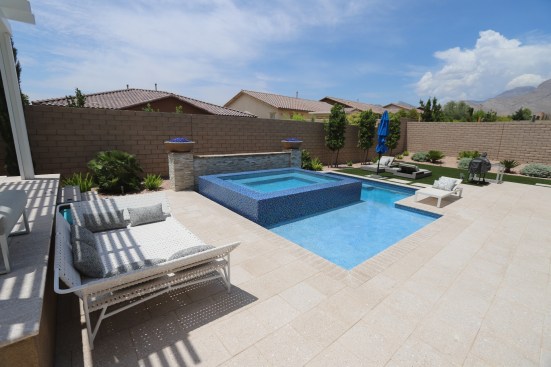 These homeowners did not seek a sprawling pool-scape that would encompass most of the backyard. Rather, they wanted a small, tightly focused spa and waterfeature to be viewed from the sliding glass door.
