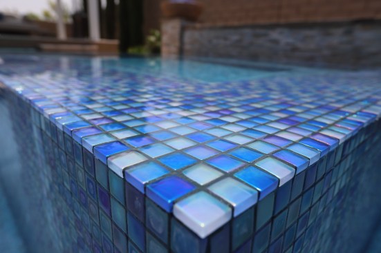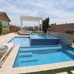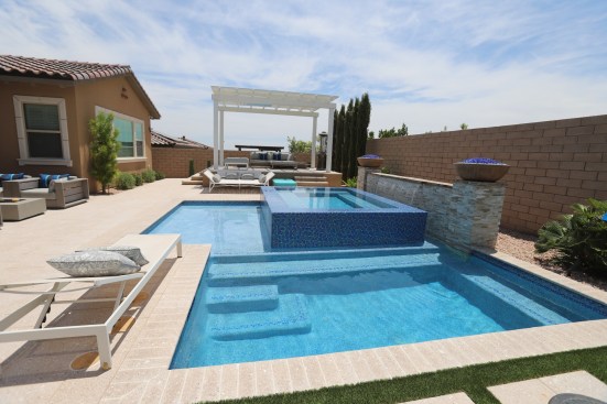 This father/son team of designer-builders obliged with a 7-by-10-foot elevated perimeter overflow spa. The spa’s outer wall is finished in a blue mosaic tile, inspired by the seashore, so it shimmers in the sun. The interior is finished in pebble.