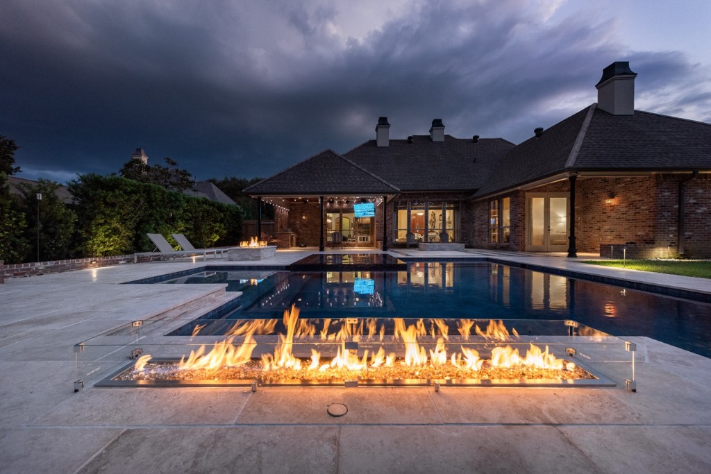They sought to balance the homeowner’s preference for modern design with the brick and neutral materials predominant in the area. So, while the client had requested white stonework, Russell determined that a more neutral palette was appropriate for the home. An ivory travertine was used instead. The modern touch came from the design’s clean lines, straight-edge coping and stone (rather than bullnosed), along with the choice of scuppers and fire features — both made of stainless steel.