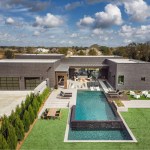 The abode itself is covered in black sealed brick and black mortar, to create as monolithic a look as possible. Because the home and pool were designed and built at about the same time, the team was able to wrap the abode around the pool area, creating a U shape, then design it so that the pool foundation helped support the home.