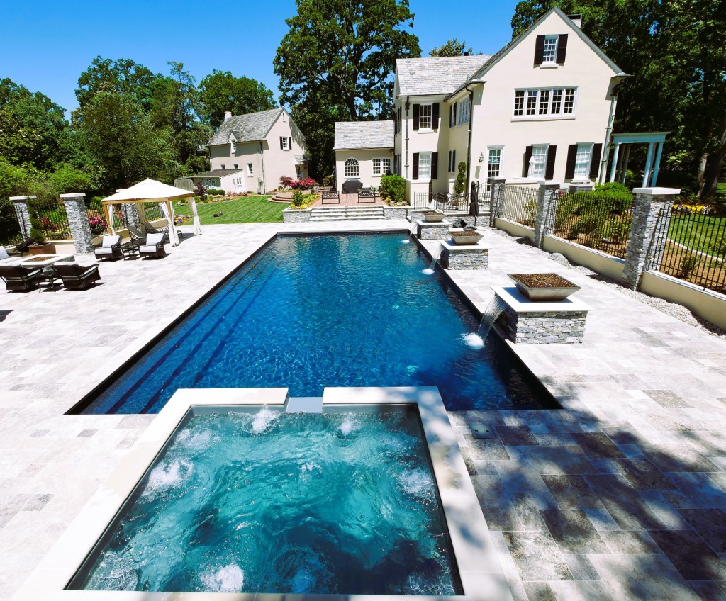 The whole outdoor aesthetic needed to fit with the house, which was built in 1928. For a classic look, Sean Hussey selected a rectangular shape with sharp corners — a tricky design to pull off with vinyl. He partnered with an architect, landscape designer, structural engineer, and many artisan craftspersons to complete the backyard look.