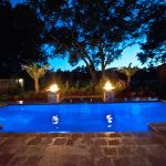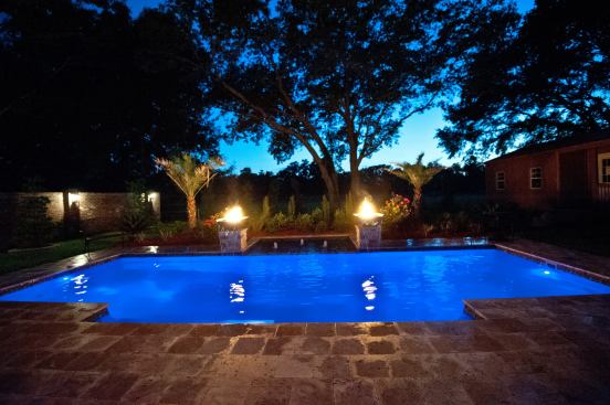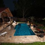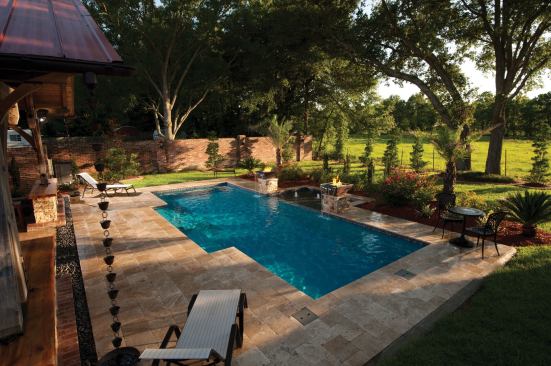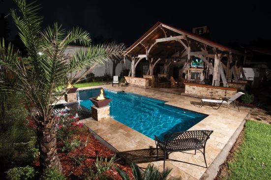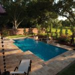 Considered design: Adding the tanning ledge to a fiberglass pool takes planning — long before construction starts. For this project, a 33-foot Elegance model by Leisure Pools was customized during manufacturing so that it would be able to accept the tanning ledge and have a proper, watertight seal, Miller says. This feature was just one of the many touches added to prove that a fiberglass pool doesn’t have to be just a shell surrounded by concrete. To match the tanning ledge, Miller utilized a glass tile pattern by National Pool Tile that complemented the form. “People are gravitating to that elegant look that they never thought they could get with a fiberglass pool,” Miller adds. “It’s a finishing touch, an accent piece for it.”