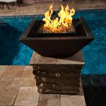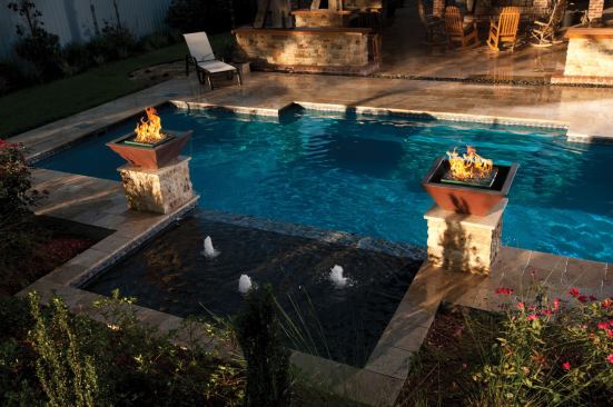 Marrying the appeal: The design originally called for a basic fiberglass pool with a tanning ledge, but the look didn’t tie into the existing backyard. To blend the pool with the patio, Brandon Miller suggested touches that provided a more cohesive aesthetic to the tight space. For instance, the patio supports, shown on the previous pages, showcase the same split-face stone as the two columns flanking the custom tanning shelf. The columns are topped with copper fire and water features, which mirror the patio’s copper gutters and unique downspouts. “[They] are actually small copper cups on a chain that reach from the roofline down to the ground, and go into a copper catch pan that sit on a travertine pedestal,” Miller adds.