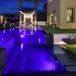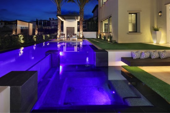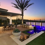 To address this issue, Fox sunk one area of the yard and placed the outdoor kitchen and spa there. To block views of the roofs from the spa, while preventing a claustrophobic feeling, he used two 8-foot-wide acrylic panels to dam up the elevated pool on two of the spa walls. “It gave them something a little more intriguing to look at,” Fox says.