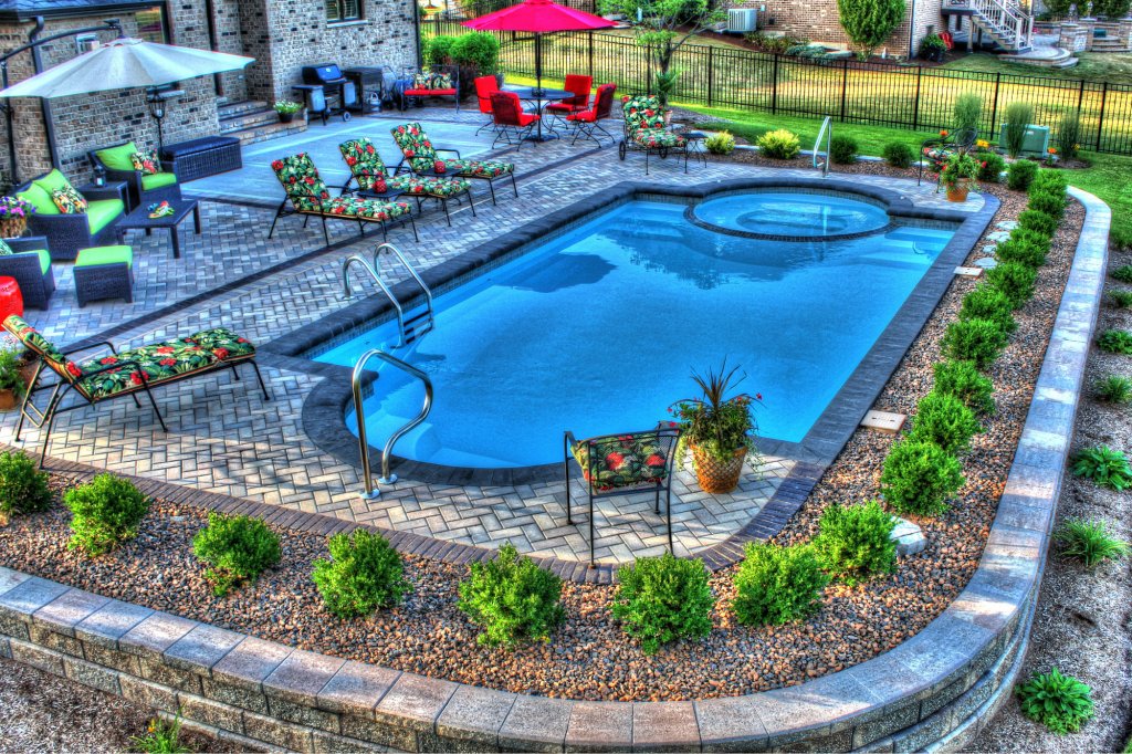 With some design flourishes, a traditionally shaped fiberglass pool takes the spotlight.