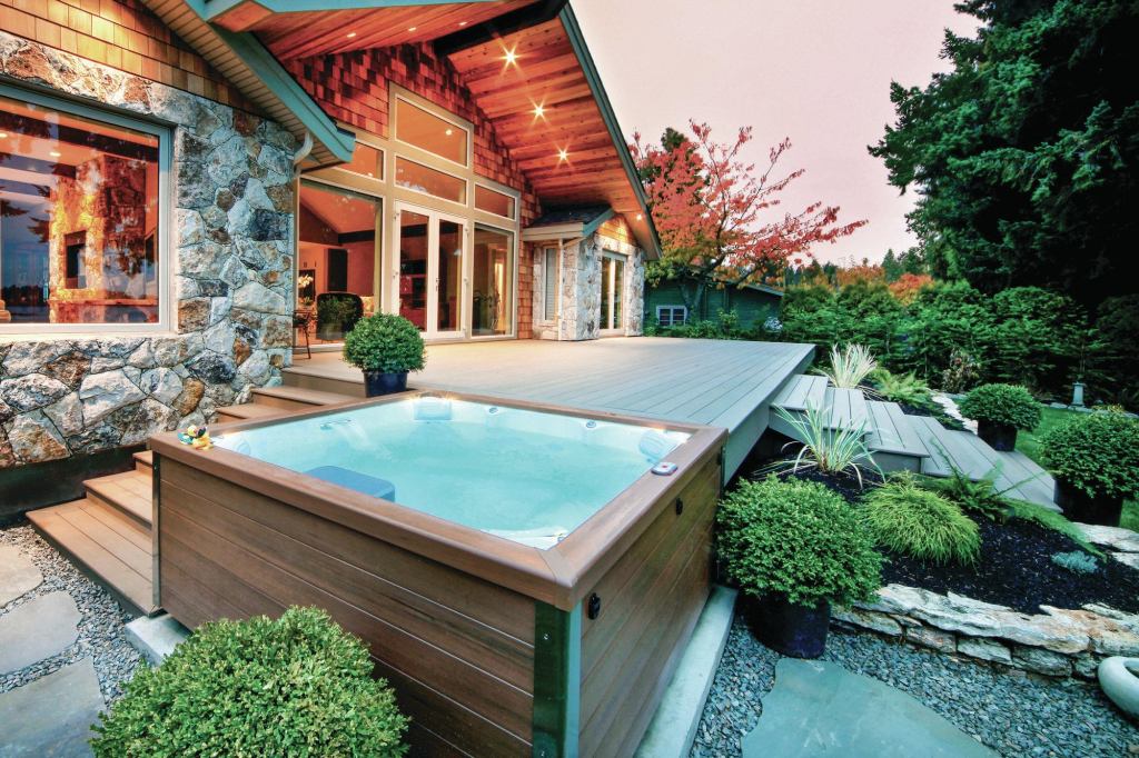 Soak in the scenery: David and Marilyn Bodnar didn’t want anything to obstruct views of a breathtaking bay that offers cresting orcas and stunning sunsets. So when they set about renovating their Vancouver Island home, keeping a clear line of sight was imperative. Deck railings were out of the question. And a spa would have to be strategically placed so as not to spoil the scenery. Furthermore, the Bodnars wanted a hot tub that blended seamlessly with their waterfront renovation. With that in mind, David Sauve, owner of The SoakHouse, worked closely with the clients to select a tub and appropriate cabinetry. “The owners were so detail conscious,” says Sauve. “They were very concerned with how it would look.” He hauled a panel of synthetic wood skirting to the Bodnars’ home to see if it would match the deck. The likeliness was close enough to make the spa appear as an extension.