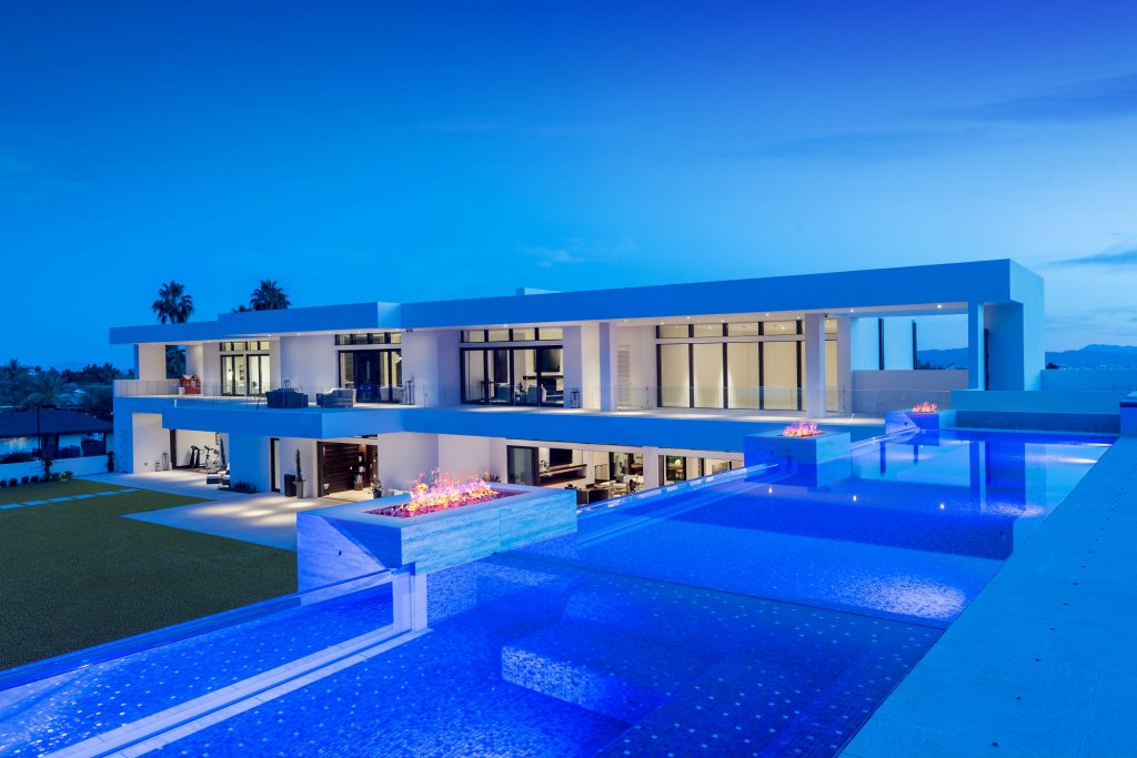 The amenities: The long, narrow pool/spa combination melds with the strong horizontal lines of the architecture, while the perimeter overflow/Lautner edge detail brings the water flush with the deck. The spa sits at the far end and features the same edge detail so it all looks like one body of water. However, when the spa is in operation, its water lowers by a fraction of an inch and the heated vessel stops overflow, so the hot and cold water don’t combine. A sunshelf in the foreground sits in about 7 inches of water. The three fire pits top support columns for the home.