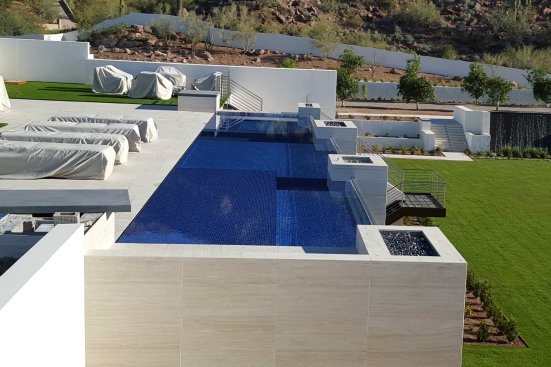 Architectural integrity: When the design team came onto this project, the plan was to build the house, then determine how a pool could be added onto the existing structure. They estimated that they could have a 1-foot-deep pool. Neither parts of that equation worked for Red Rock Pools & Spas. “The pool wouldn’t really work on the roof of the structure without it being extremely shallow, not matching the architecture at all, or breaking up the lines or the architecture,” says Rick Chafey. “So we got in with the client and looked at how we could accomplish the concept of a rooftop pool and yet have it mold and meld into the architecture seamlessly so it doesn’t look like a pimple on the side of the building or be a nonfunctional body of water.” One key to success was building the pool such that it would not be supported by the building, but actually serve as part of the abode’s reinforcement. The other was blending the clean, long lines with the outer glass panels for a stunning minimalism. The home was built by Brimley Development of Scottsdale, Ariz.
