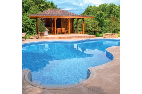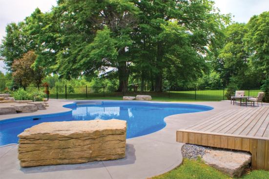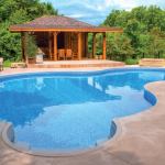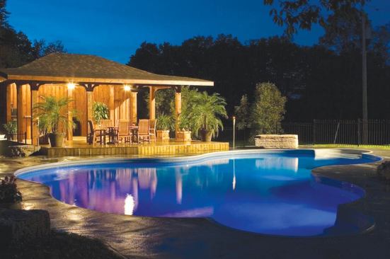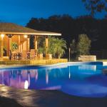 Although much of the concrete deck paver is swirled finish of charcoal gray, the liner’s rich blue coloring helps reinforce the idea of a warmer locale, illuminated by three color-changing LED lights and an overhead glow from the cabana. Coupled with miniature potted palms, the homeowner’s vision for a tropical retreat really starts to take form.